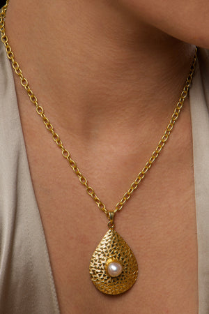 The Ivy pendant showcases a luminous freshwater pearl elegantly framed by a gold-plated teardrop base with intricate textural details. Expertly handcrafted using hypoallergenic materials, this piece combines refined craftsmanship with lasting comfort. Its understated sophistication enhances any ensemble, making it a versatile addition to your jewelry collection.